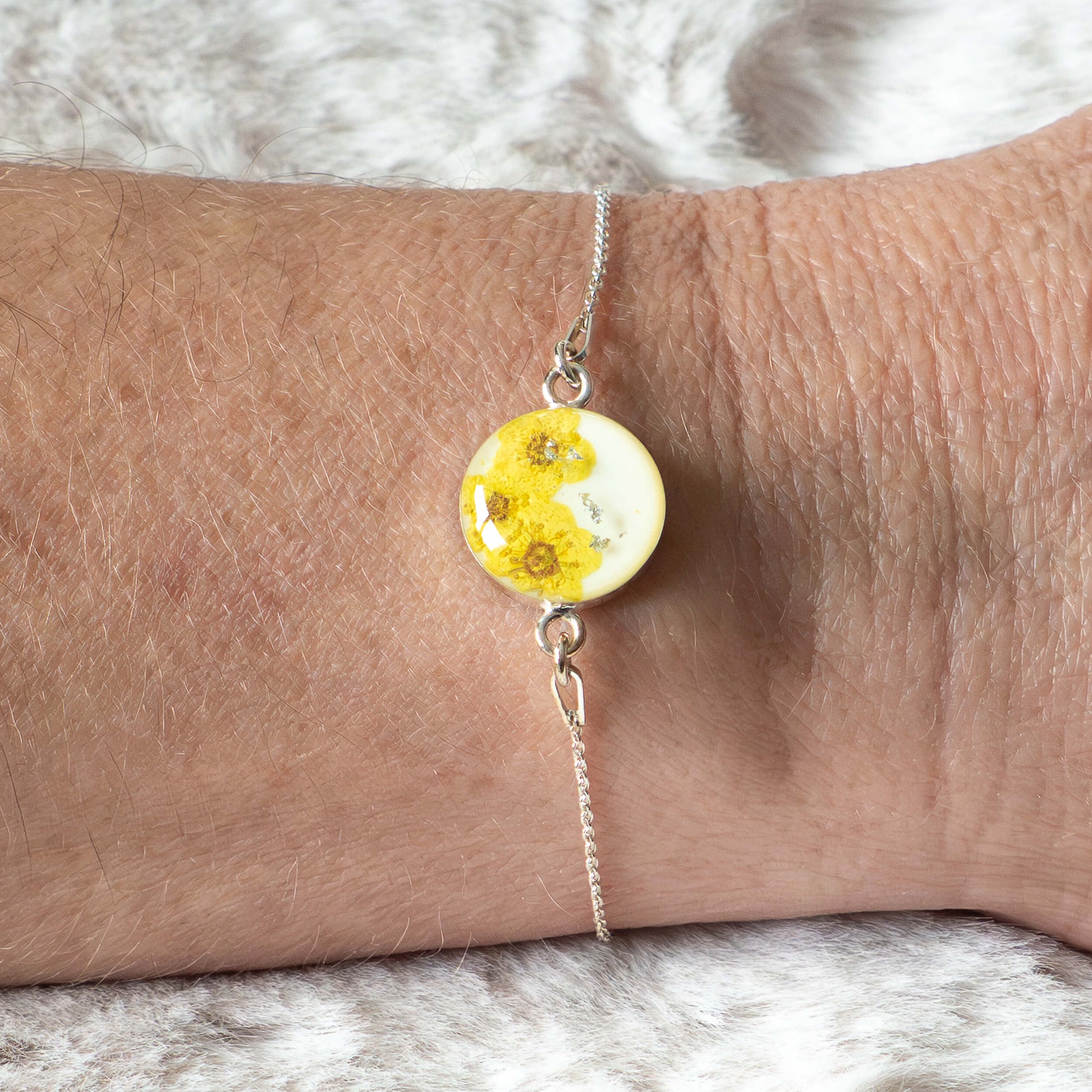 Diese zarte Armkette aus 925 Sterling Silber begeistert durch ihre schlichte Eleganz und die natürliche Symbolik der Blüten. Der 14 mm große, runde Cabochon-Anhänger aus klarem Epoxidharz enthält drei echte Spieren-Blüten, die in einem strahlenden Gelb eingefärbt sind, sowie glanzvolle Silberflocken. Die sonnigen Blüten stehen für Lebensfreude und Optimismus, während die Silberflocken dem Schmuckstück eine luxuriöse Note verleihen.