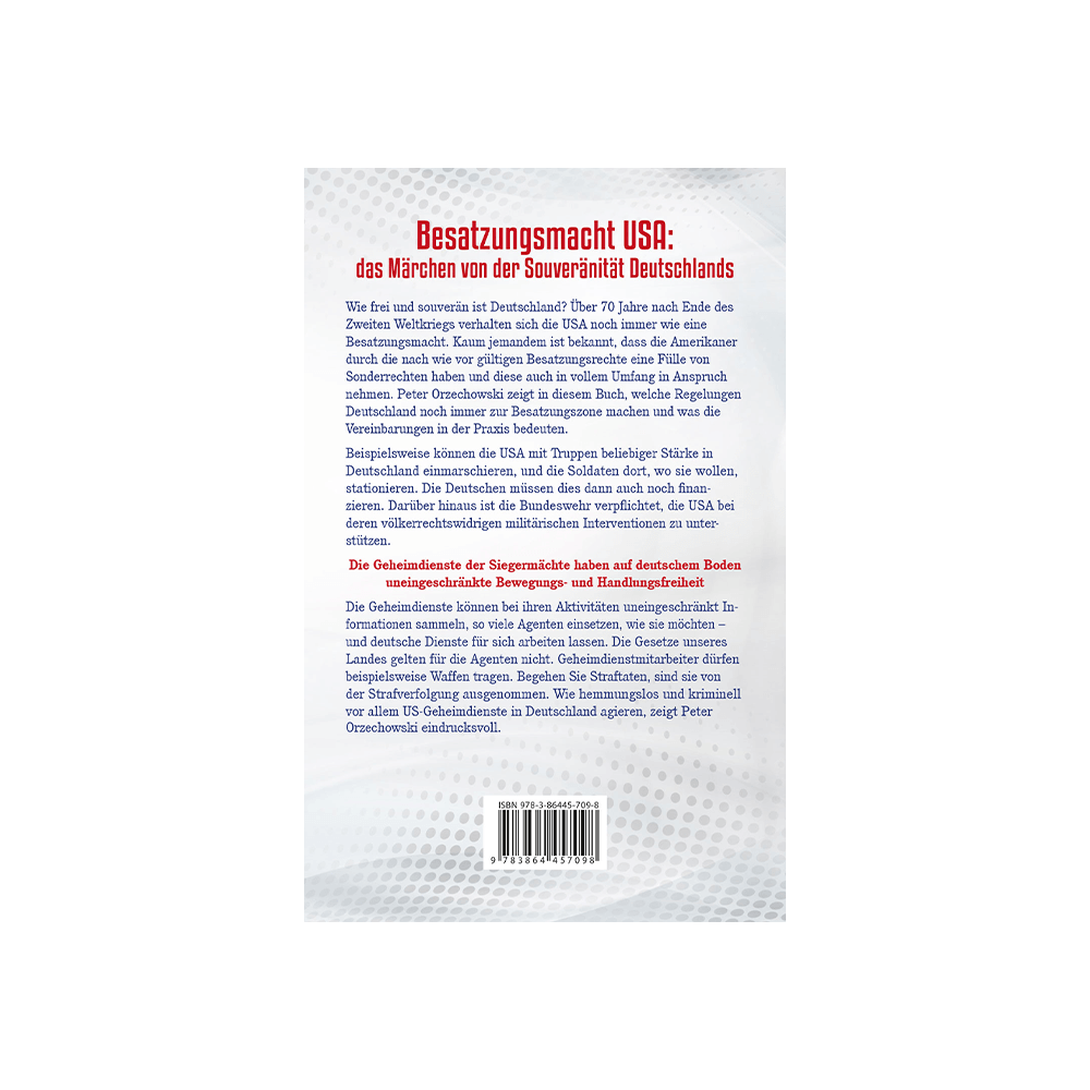 Wie frei und souverän ist Deutschland? Über 70 Jahre nach Ende des Zweiten Weltkriegs verhalten sich die USA noch immer wie eine Besatzungsmacht. Kaum jemandem ist bekannt, dass die Amerikaner durch die nach wie vor gültigen Besatzungsrechte eine Fülle von Sonderrechten haben und diese auch in vollem Umfang in Anspruch nehmen. Peter Orzechowski zeigt in diesem Buch, welche Regelungen Deutschland noch immer zur Besatzungszone machen und was die Vereinbarungen in der Praxis bedeuten.