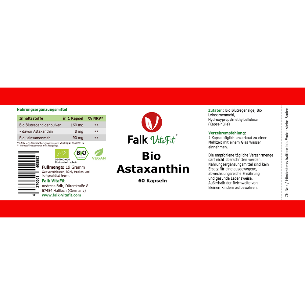Da Astaxanthin sehr gut fettlöslich ist, wird die Aufnahme im Darm verbessert, wenn zusätzlich ein fetthaltiges Nahrungsmittel verzehrt wird. Zusätzlich ist den Kapseln Bio-Leinsamenmehl beigefügt, um die Bioverfügbarkeit weiter zu steigern. Dieses Bio-Produkt von Falk VitaFit ist frei von unnötigen Zusatzstoffen und wird unter Berücksichtigung höchster Qualitätsstandards produziert.