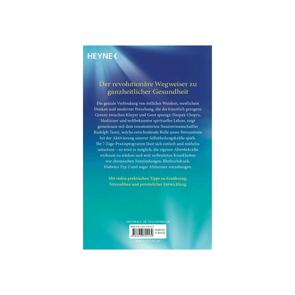 Der revolutionäre Wegweiser zu ganzheitlicher Gesundheit, der die künstlich gezogene Grenze zwischen Körper und Geist sprengt: Deepak Chopra, Mediziner und weltbekannter spiritueller Lehrer, zeigt gemeinsam mit dem renommierten Neurowissenschaftler Rudolph Tanzi, welche entscheidende Rolle unser Bewusstsein bei der Aktivierung unserer Selbstheilungskräfte spielt. Ihr 7-Tage-Aktionsplan lässt sich einfach und mühelos umsetzen und umfasst praktische Tipps zu Ernährung, Entspannung und geistiger Entwicklung. So wird es möglich, die eigenen Abwehrkräfte wirksam zu stärken und zahlreichen verbreiteten Krankheiten wie chronischen Entzündungen, Bluthochdruck, Diabetes Typ 2 und sogar Alzheimer vorzubeugen.