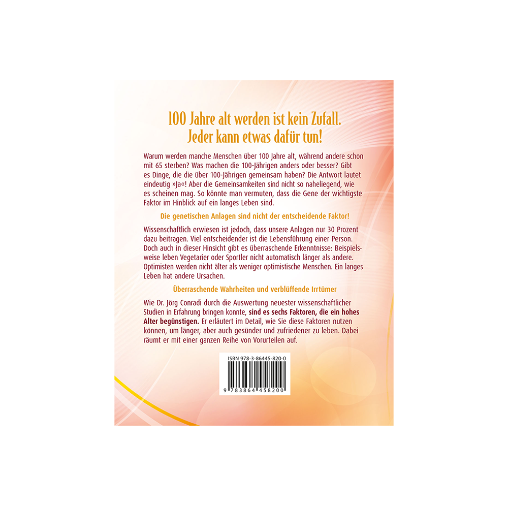 Damit Sie ermitteln können, ob Ihre Lebensweise auf eine hohe Lebenserwartung hindeutet, hat der Autor einen Selbsttest entwickelt. Sollte die Beantwortung der Testfragen ergeben, dass Sie eher zu den Menschen mit einer niedrigen Lebenserwartung gehören, hat Dr. Jörg Conradi gute Nachrichten für Sie: Es ist nicht schwer, die sechs Faktoren, die ein hohes Alter begünstigen, in Ihren Alltag zu integrieren. Schon einfache Maßnahmen wirken sich äußerst positiv auf Ihre Lebenserwartung aus.