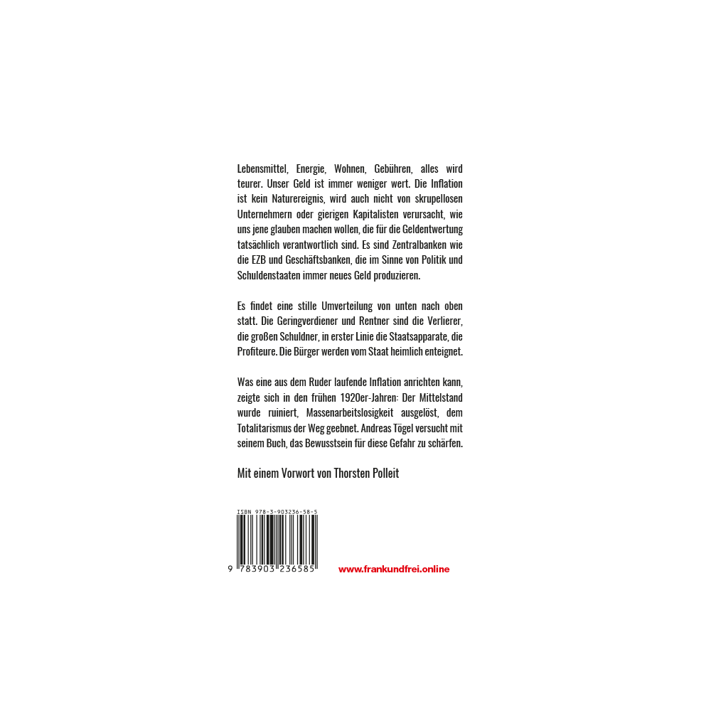 Lebensmittel, Energie, Wohnen, Gebühren, alles wird teurer. Unser Geld ist immer weniger wert. Die Inflation ist kein Naturereignis, wird auch nicht von skrupellosen Unternehmern oder gierigen Kapitalisten verursacht, wie uns jene glauben machen wollen, die für die Geldentwertung tatsächlich verantwortlich sind. Es sind Zentralbanken wie die EZB und Geschäftsbanken, die im Sinne von Politik und Schuldenstaaten immer neues Geld produzieren. Es findet eine stille Umverteilung von unten nach oben statt. Die Geringverdiener und Rentner sind die Verlierer, die großen Schuldner, in erster Linie die Staatsapparate, die Profiteure. Die Bürger werden vom Staat heimlich enteignet. Was eine aus dem Ruder laufende Inflation anrichten kann, zeigte sich in den frühen 1920er-Jahren: Der Mittelstand wurde ruiniert, Massenarbeitslosigkeit ausgelöst, dem Totalitarismus der Weg geebnet.
