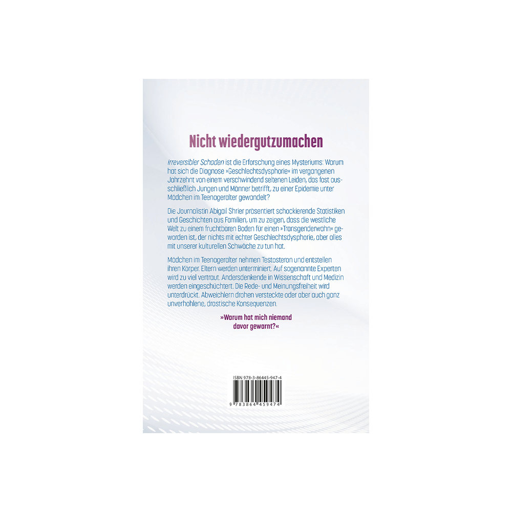 Die Journalistin Abigail Shrier präsentiert schockierende Statistiken und Geschichten aus Familien, um zu zeigen, dass die westliche Welt zu einem fruchtbaren Boden für einen „Transgenderwahn“ geworden ist, der nichts mit echter Geschlechtsdysphorie, aber alles mit unserer kulturellen Schwäche zu tun hat.