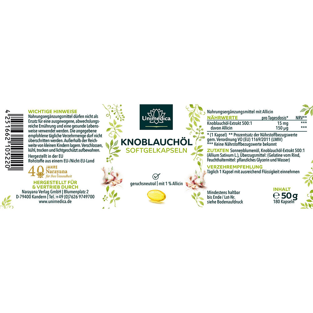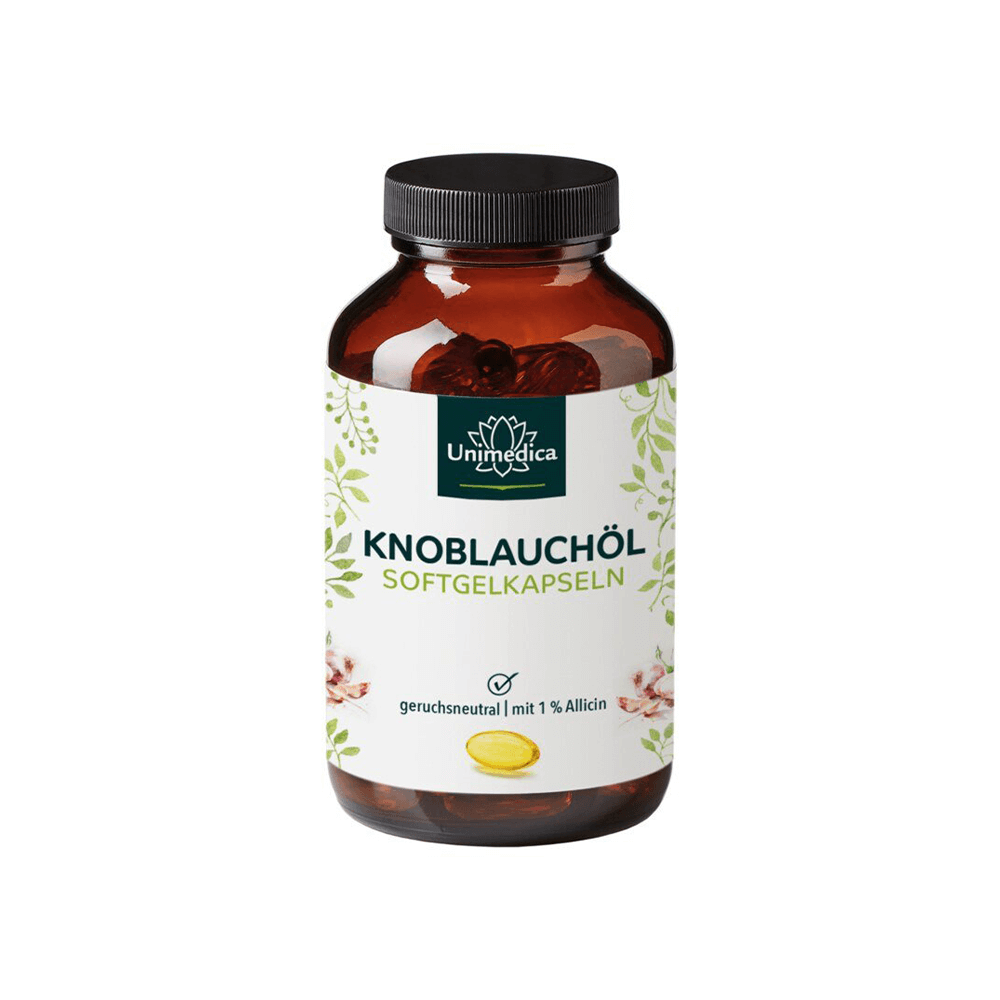 Mit den Knoblauchöl Kapseln von Unimedica präsentiert sich der Knoblauch in einer modernen und komfortablen Form: nahezu geruchs- und geschmacksneutral und einfach einzunehmen. Durch schonende natürliche Fermentation und gelöst in Sonnenblumenöl entsteht der hochwertige Knoblauchöl-Extrakt in der Konzentration 500:1 für unsere kleinen, mundgerechten Softgelkapseln.