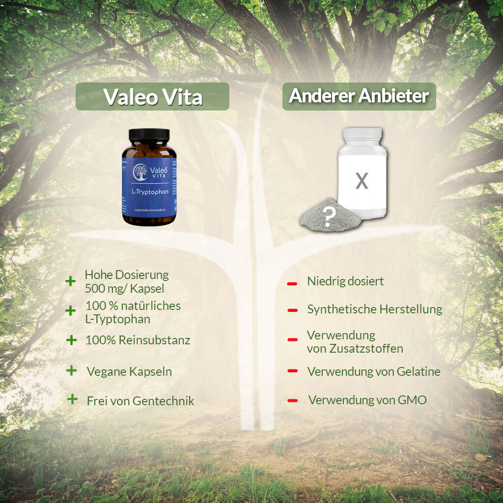 Das so entstehende L-Tryptophan überzeugt durch eine hohe Bioverfügbarkeit sowie eine hohe Reinheit und Natürlichkeit. Valeo Vita Kapseln sind generell vegan, frei von Gentechnik (GMO) und bieten Ihnen eine natürliche Ergänzung für Ihre tägliche Versorgung.