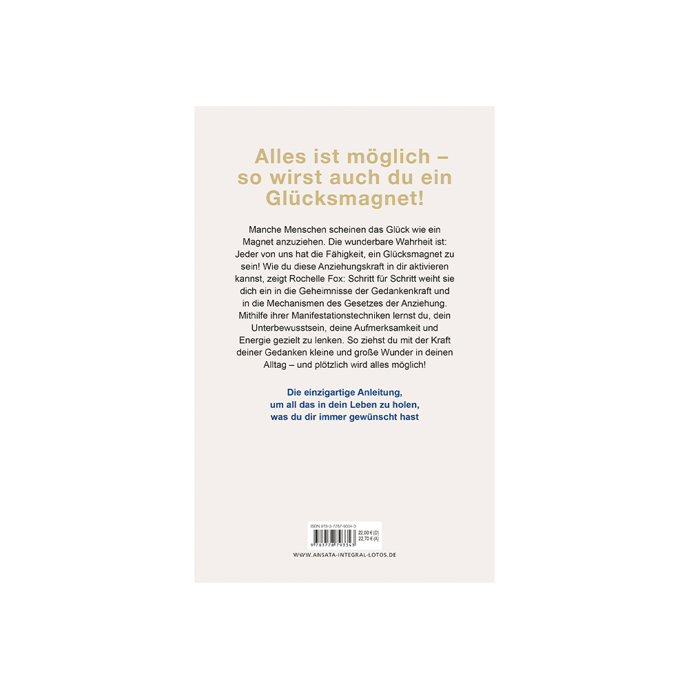 Manche Menschen scheinen das Glück wie ein Magnet anzuziehen. Die wunderbare Wahrheit ist: Jeder von uns hat die Fähigkeit, ein Glücksmagnet zu sein! Der englische Shootingstar Rochelle Fox zeigt, wie wir diese Anziehungskraft in uns aktivieren können. Schritt für Schritt weiht sie uns ein in die Geheimnisse der positiven Gedankenkraft und in die Wirkmechanismen des Gesetzes der Anziehung. Mithilfe ihrer Meditations- und Manifestationstechniken lernen wir, unser Unterbewusstsein, unsere Aufmerksamkeit und Energie gezielt zu lenken. So ziehen wir mit der Kraft unseres Geistes kleine und große Wunder in unseren Alltag – und plötzlich wird alles möglich!