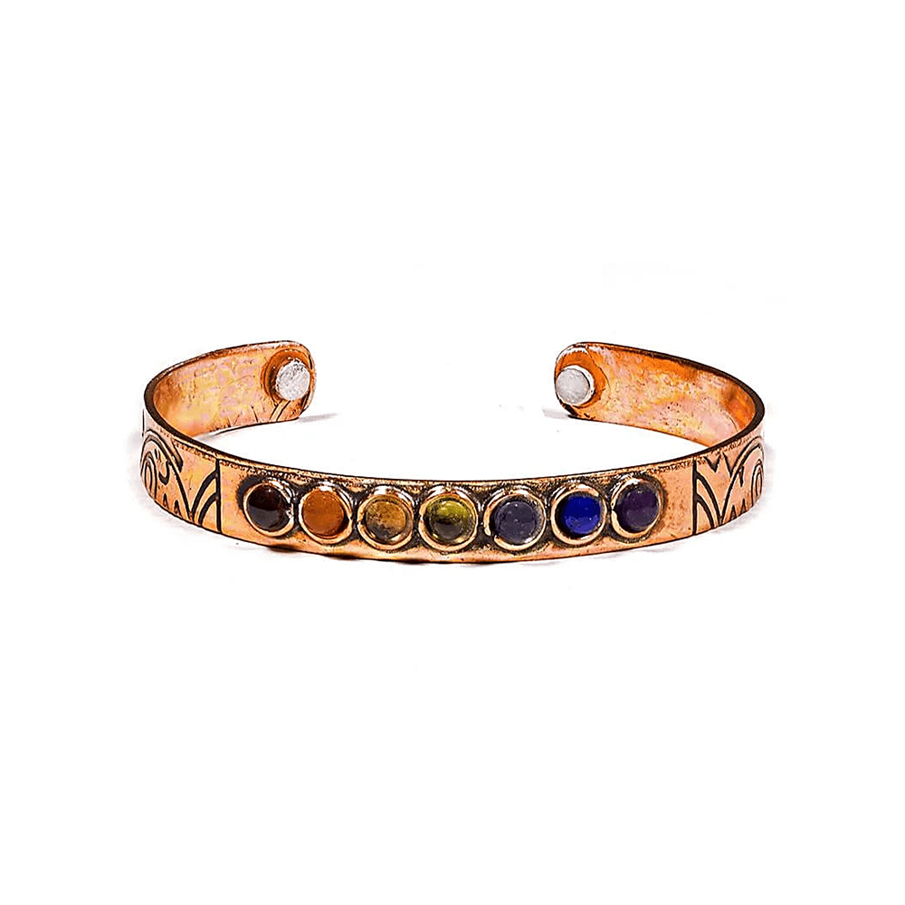 Armband aus magnetisiertem Kupfer mit eingelegtem Granat, Karneol, Citrin, Chrysolith, Lolit, Lapislazuli und Amethyst (Farben der 7 Chakren).