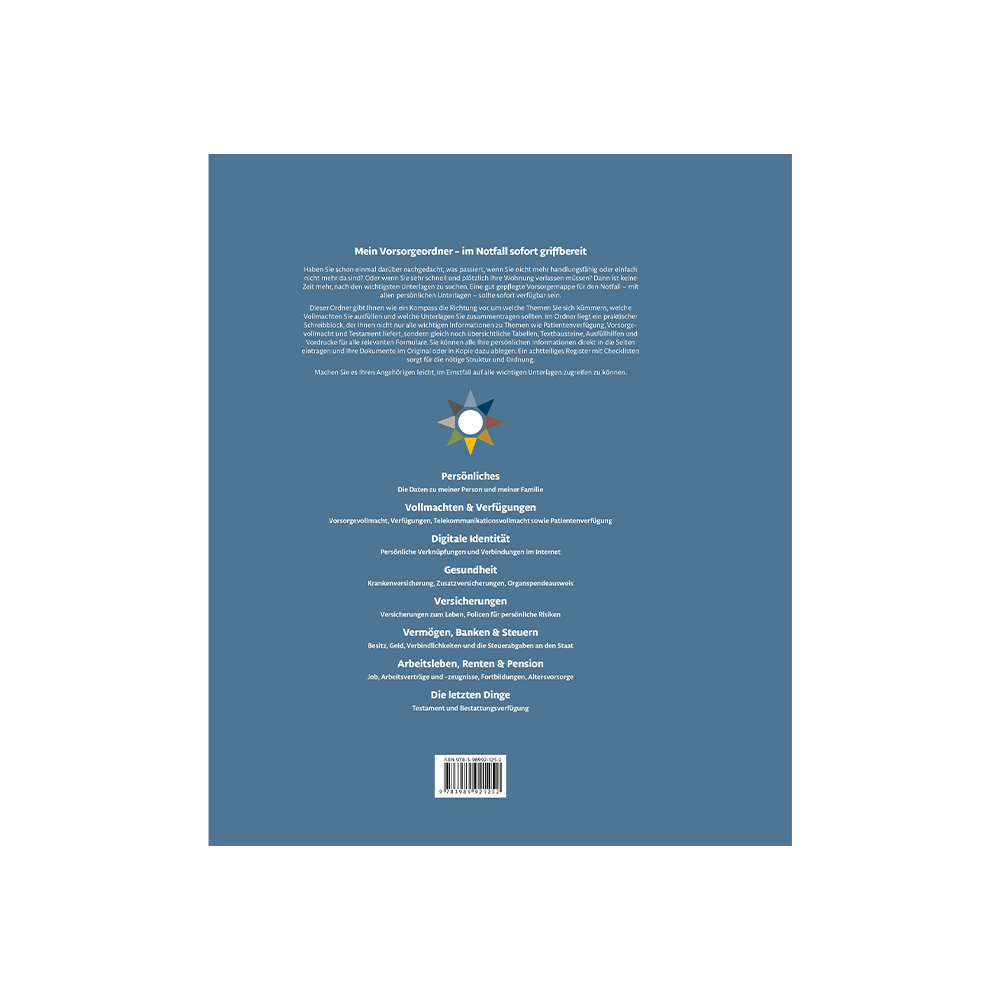 Er gibt Ihnen wie ein Kompass die Richtung vor, um welche Themen Sie sich kümmern, welche Vollmachten Sie ausfüllen und welche Unterlagen Sie zusammentragen sollten. Im Ordner liegen praktische Anleitungen, die Ihnen nicht nur alle wichtigen Informationen zu Themen wie Patientenverfügung, Vorsorgevollmacht und Testament liefern, sondern zusätzlich übersichtliche Tabellen, Textbausteine, Ausfüllhilfen und Vordrucke für alle relevanten Formulare. Sie können alle Ihre persönlichen Informationen direkt in die Seiten eintragen und Ihre Dokumente im Original oder in Kopie dazu ablegen.