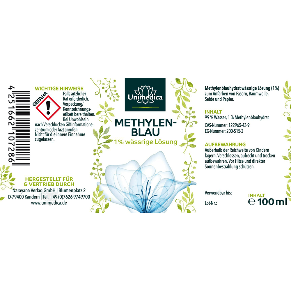 Methylenblau 1% Lösung von Unimedica enthält hochwertiges Methylenblau mit einer pharmazeutischen Reinheit von 99,8 % und ist frei von Schwermetallen.