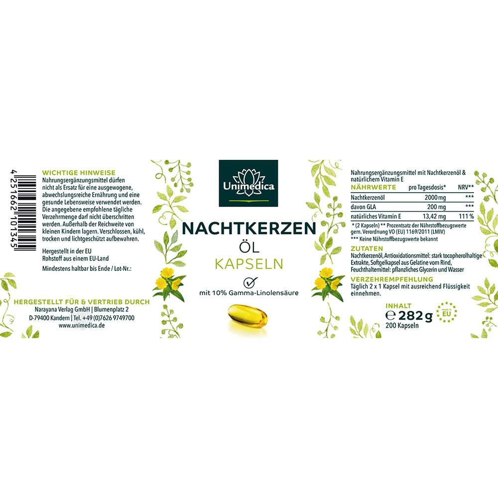 Nachtkerzenöl Kapseln von Unimedica sind, entsprechend gesetzlicher Vorgaben, frei von Aromen, Farbstoffen, Stabilisatoren, Magnesiumstearat sowie ohne Gentechnik, laktosefrei und glutenfrei.