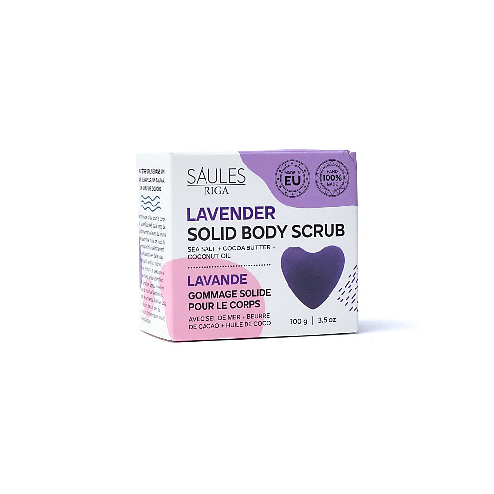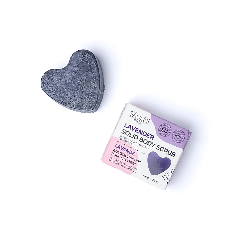 Die feste Körperpeelingseife ist zu 100 % handgemacht und besteht aus natürlichem Meersalz, Kakaobutter und Kokosnussöl. Sie hat eine praktische Größe und peelt, pflegt und strafft die Haut. Angereichert ist die Seife mit getrockneten Lavendelblüten, die das Gefühl der Entspannung verstärken.