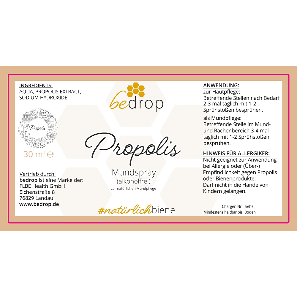 Das alkoholfreie Propolis Tinktur (Mund-) Spray von bedrop enthält reines Propolis aus 100 % natürlichem Ursprung – ganz ohne Zusatzstoffe oder Chemie. Das hochwertige Propolis stammt aus sorgfältig ausgewählten, regionalen und überregionalen Imkereien (z. B. aus Lettland) in ländlicher, naturbelassener Umgebung.
