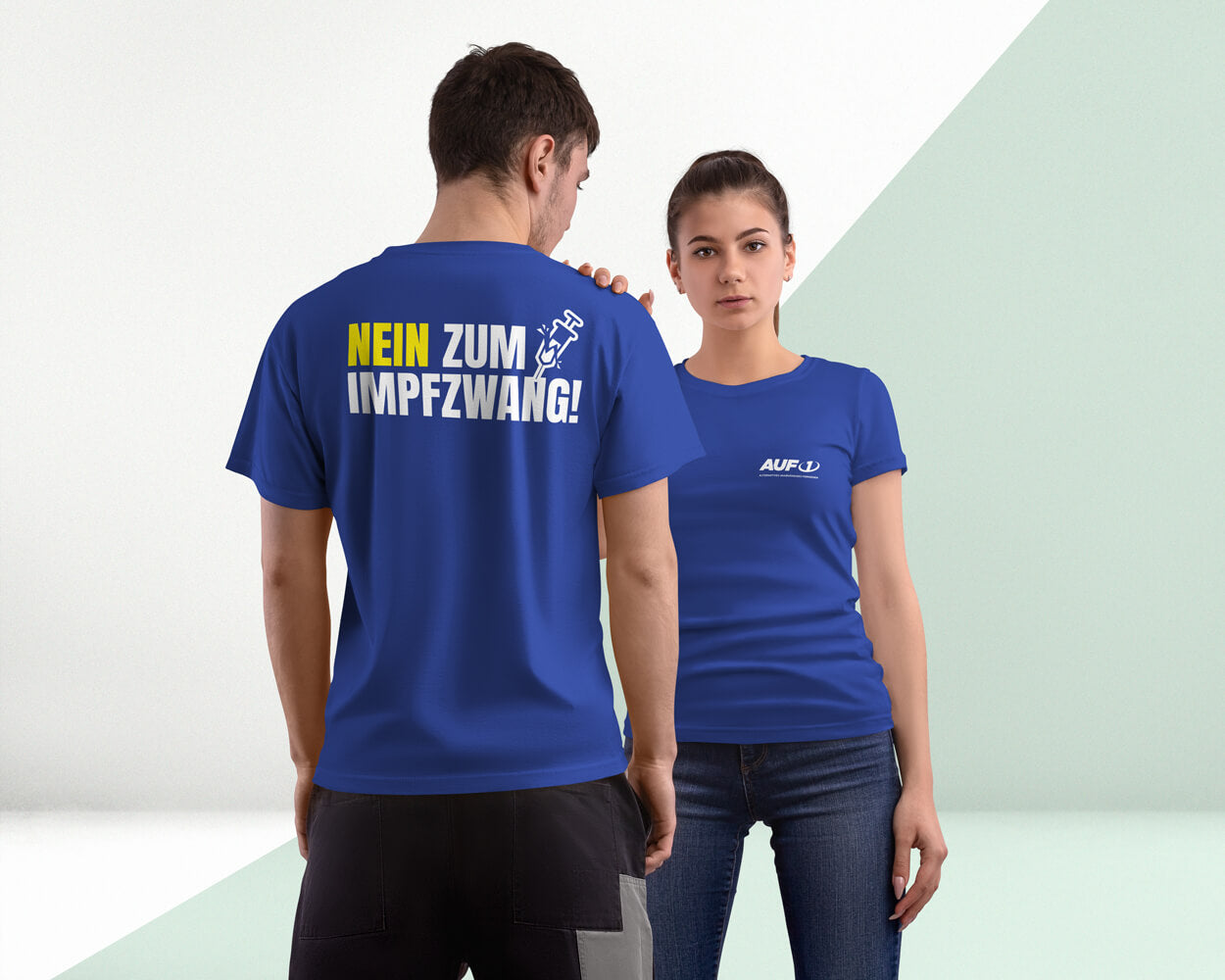 • mit AUF1-Logo auf der Vorderseite und Schriftzug „Nein zum Impfzwang“ auf der Rückseite