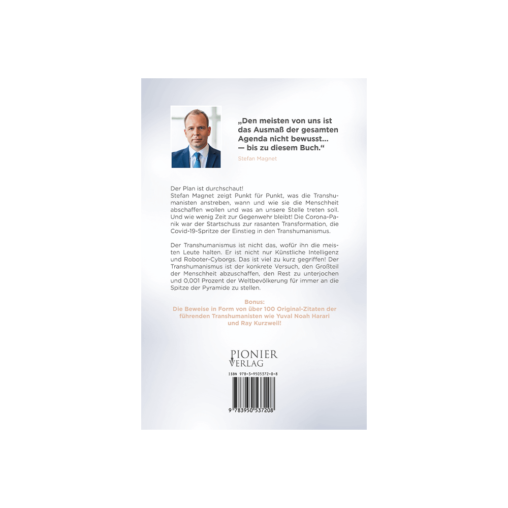 Der Plan ist durchschaut! Stefan Magnet zeigt Punkt für Punkt, was die Transhumanisten anstreben, wann und wie sie die Menschheit abschaffen wollen und was an unsere Stelle treten soll. Und wie wenig Zeit zur Gegenwehr bleibt! Die Corona-Panik war der Startschuss zur rasanten Transformation, die Covid19-Spritze der Einstieg in den Transhumanismus. Was geplant und vielfach in Umsetzung ist: Nanoroboter im Blut, Mikrochips unter der Haut, Gedanken mittels Elektroden lenken, Mensch und Maschine verschmelzen, Cyborgs züchten und Gehirne mit der Cloud koppeln. Doch die bedrohlichste Aussicht: Die Menschheit wird unfruchtbar, stattdessen entstehen Babys künstlich im Labor. Für Transhumanisten haben Menschen keine Seele und keinen freien Willen. Dafür wollen sich die wenigen milliardenschweren Auserwählten selbst zu Göttern erheben. Sie reißen das Monopol der Schöpfung an sich. Totale Kontrolle!