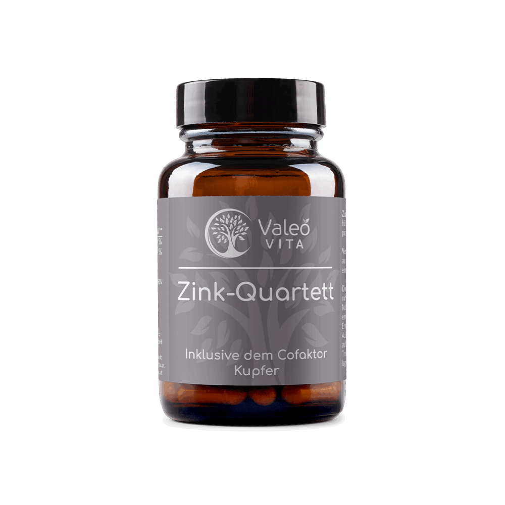 Valeo Vita Zink-Quartett inklusive Kupfer kombiniert vier hochwertige Zinkverbindungen – Zinkbisglycinat, Zinkcitrat, Zinkgluconat und Zinkpicolinat – mit Kupfercitrat. Diese Vielfalt sorgt für eine optimale Bioverfügbarkeit und Aufnahme im Körper. Als natürliche Ballaststoffbasis dient Akazienfaser.